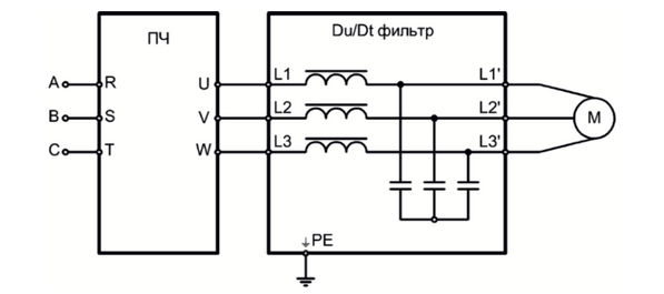 Фильтр dU/dt — это пассивный электронный компонент, который устанавливается между частотным преобразователем и электродвигателем. Снижает скорость нарастания напряжения (dU/dt) и уменьшает пиковые перенапряжения на клеммах электродвигателя, возникающие из-за ШИМ