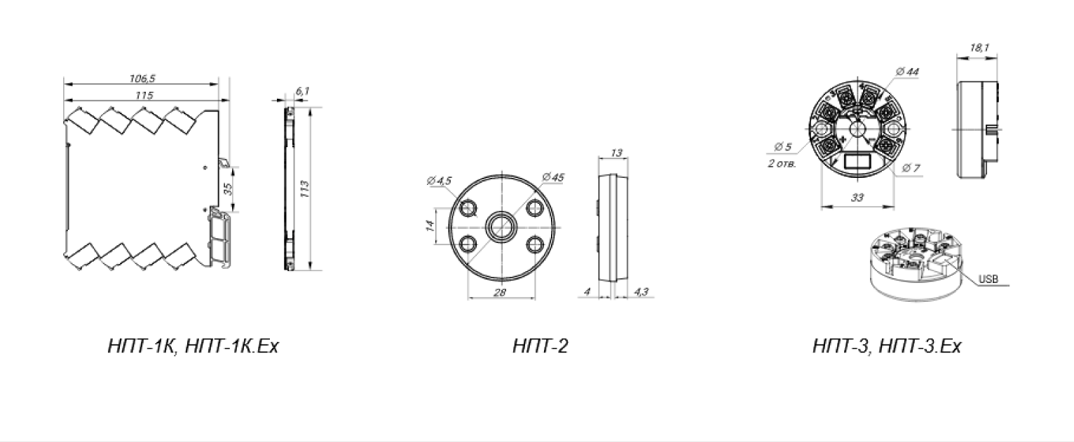 - НПТ-1 – 4…20 мА, 0…20 мА, 0…5 мА, 0…10 В, 0…5 В, 2…10 В (универсальный).