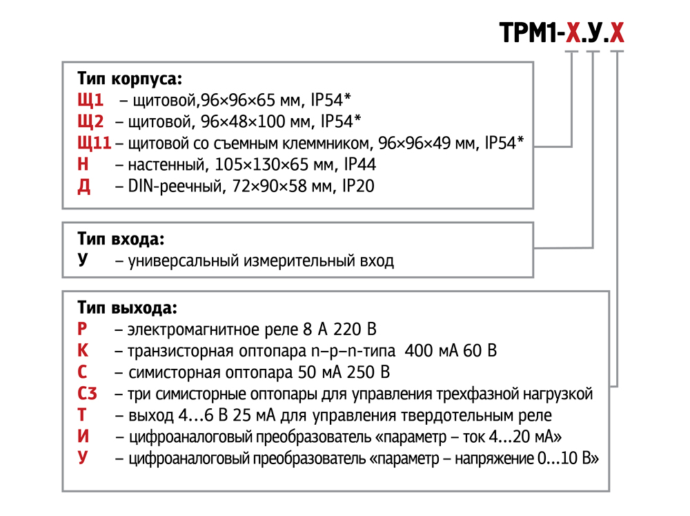 Р – э/м реле К – транзисторная оптопара С – симисторная оптопара С3 – три симисторные оптопары И – ЦАП «параметр – ток 4...20 мА» У – ЦАП «параметр – напряжение 0...10 В» Т – выход для управления твердотельным реле |