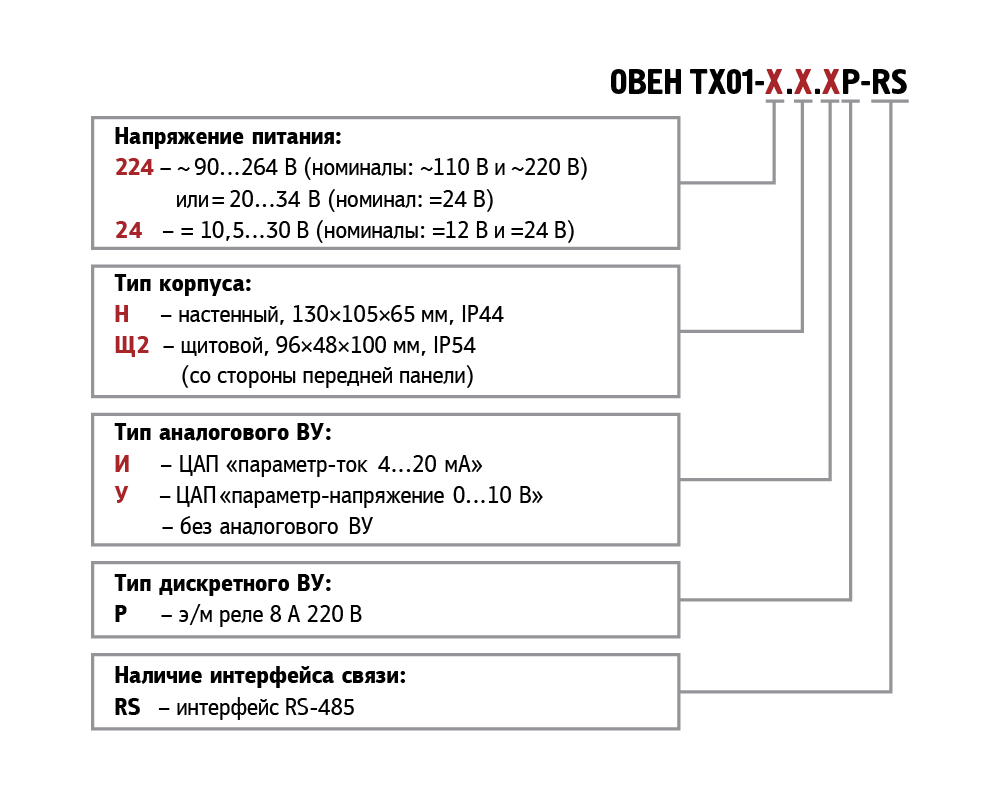 Диапазон переменного напряжения ТХ01-Х.Х.ХР-RS напряжение, В частота, Гц |