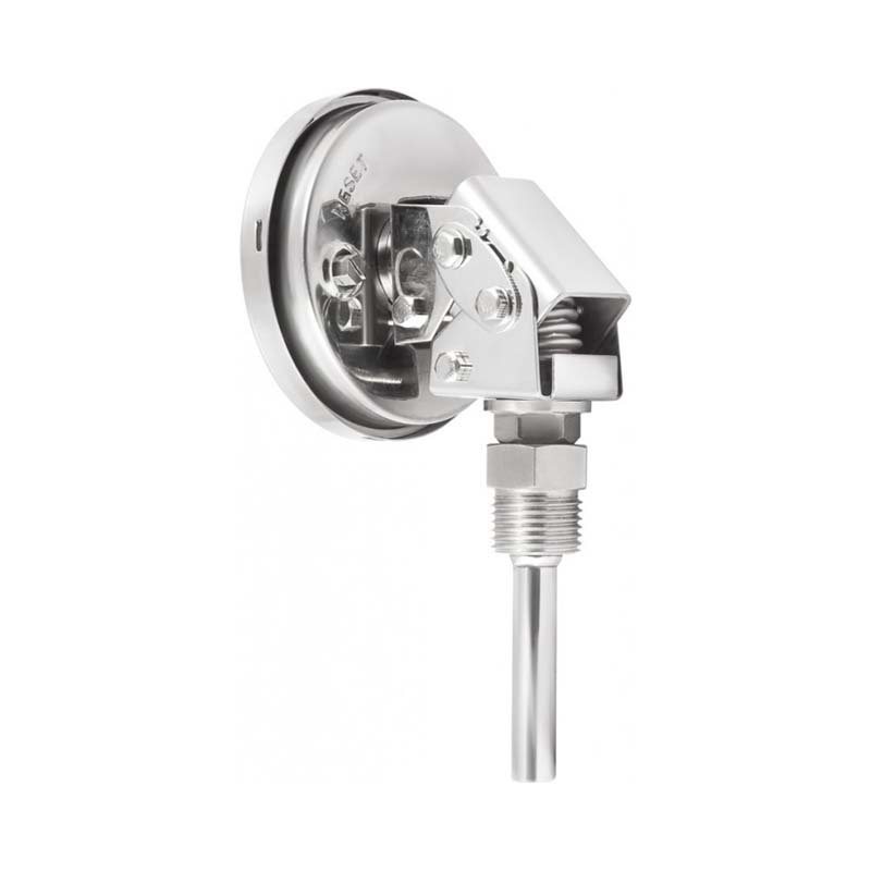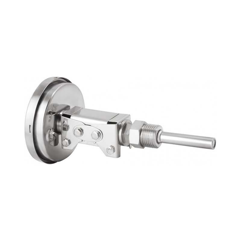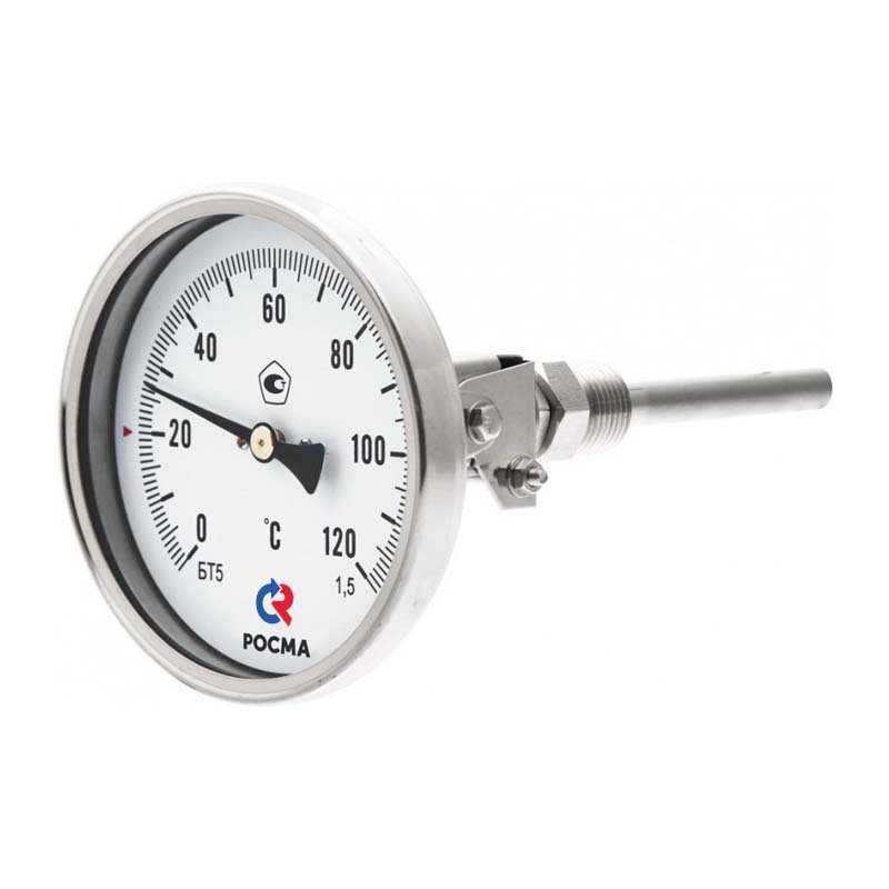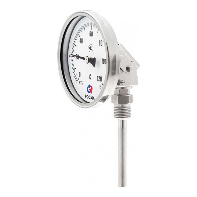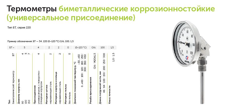 Тип БТ, серия 220. Коррозионностойкий термометр с универсальным присоединением (поворотно-откидным корпусом) с резьбой на штоке. Предназначен для измерения температуры агрессивных жидкостей и газов. Принцип действия термометров БТ основан на зависимости деформации чувствительного элемента от измеряемой температуры. В качестве чувствительного элемента используется биметаллическая пружина. Биметаллическая пружина изготавливается из двух прочно соединенных металлических пластин, имеющих различные температурные коэффициенты линейного расширения. При изменении температуры пружина изгибается и вращает стрелку термометра. Один конец пружины закреплен внутри штока, а к другому присоединяется ось стрелки.