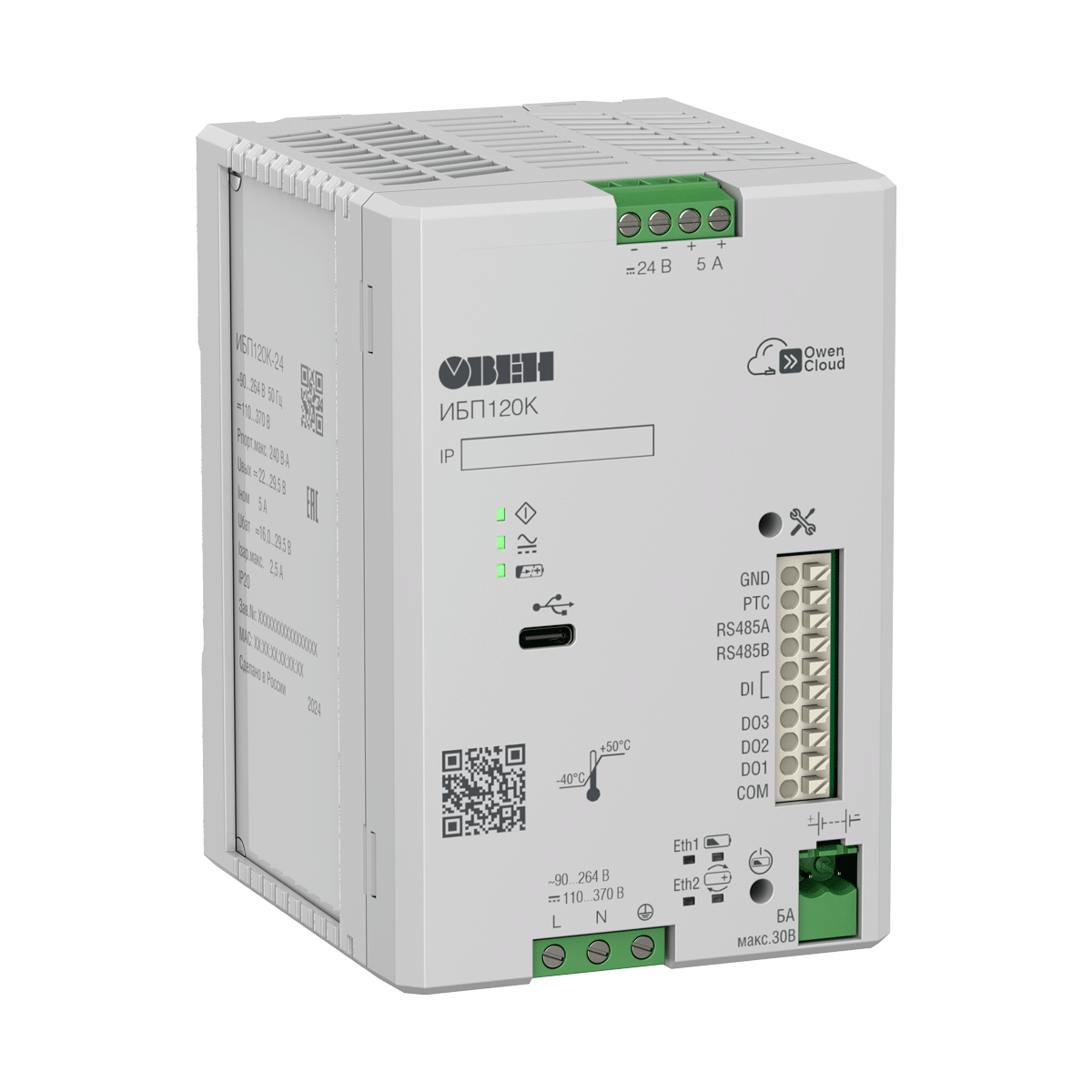 ОВЕН ИБП120К – источник питания с резервированием для питания стабилизированным выходным напряжением 24 В приборов промышленной автоматики в распределенных системах управления.