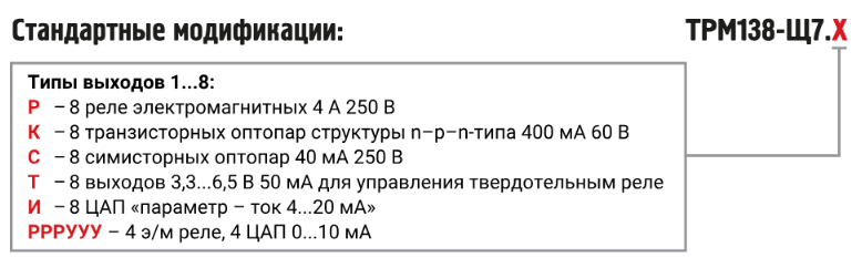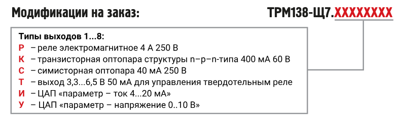 - Восемь выходных устройств с управлением исполнительными механизмами по ПИД-, двухпозиционному или П-регулированию. Тип выходных устройств указывается при заказе, доступны любые комбинации