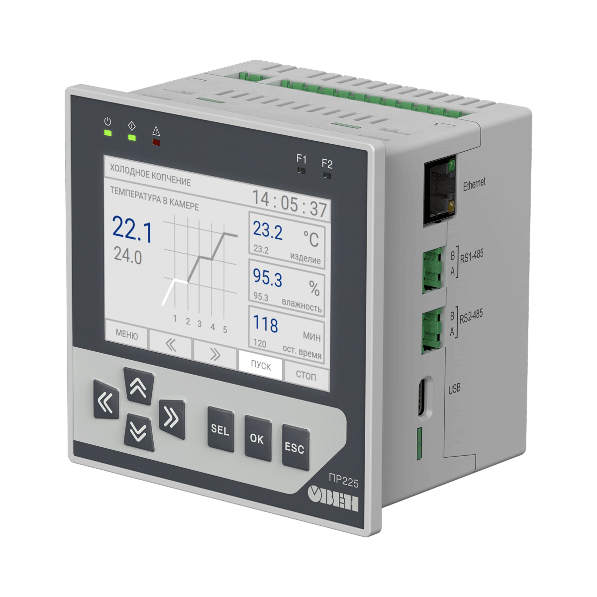 Интерфейс Ethernet позволяет интегрировать прибор в распределенные системы, увеличивать количество входов-выходов с помощью модулей ввода-вывода Мх210, удаленно контролировать и управлять оборудованием с помощью облачного сервиса OwenCloud. В зависимости от модификации у ПР225 предусмотрено до 2-х интерфейсов RS-485. Это позволяет расширить систему с помощью модулей Мх110 для управления исполнительными механизмами или передачи данных на верхний уровень.