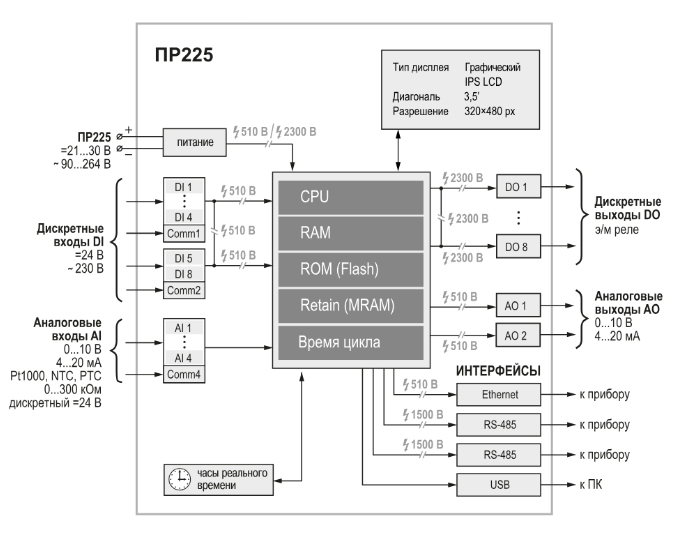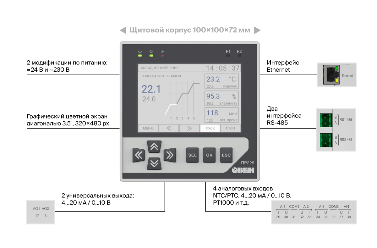 ПР225 – новое программируемое реле в щитовом корпусе с графическим дисплеем и Ethernet. Прибор сочетает в себе оптимальную конфигурацию аналоговых и дискретных входов-выходов для управления в системах водоснабжения, отопления, кондиционирования, вентиляции, пищевой промышленности и др.
