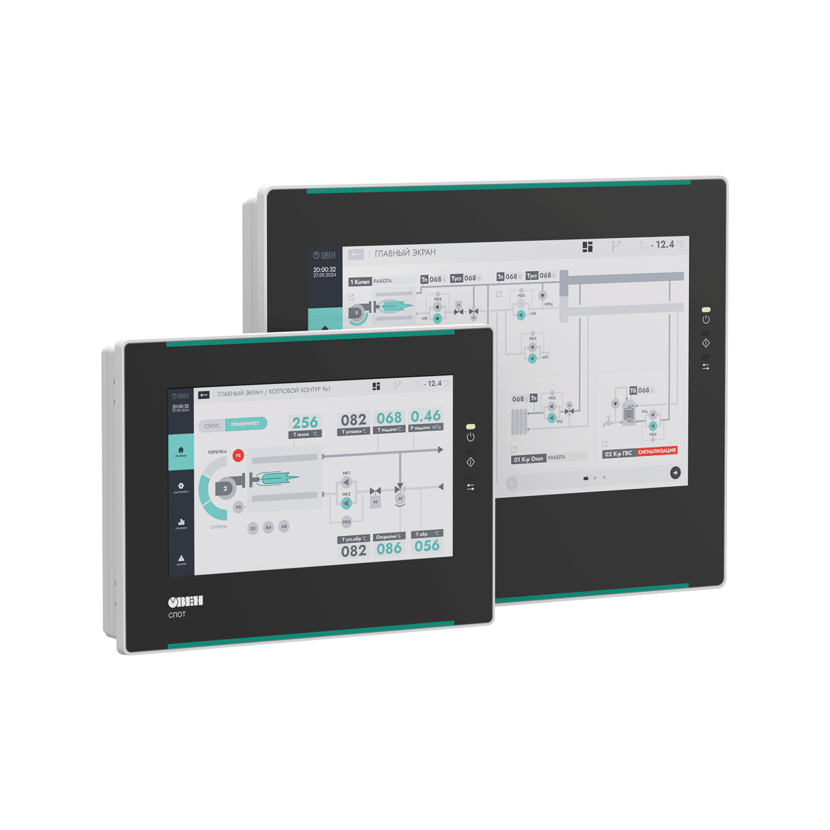 Главный экран панели отображает схему всего объекта с ключевыми параметрами. При необходимости пользователь может перейти к конкретному контуру и получить подробную информацию по его работе.