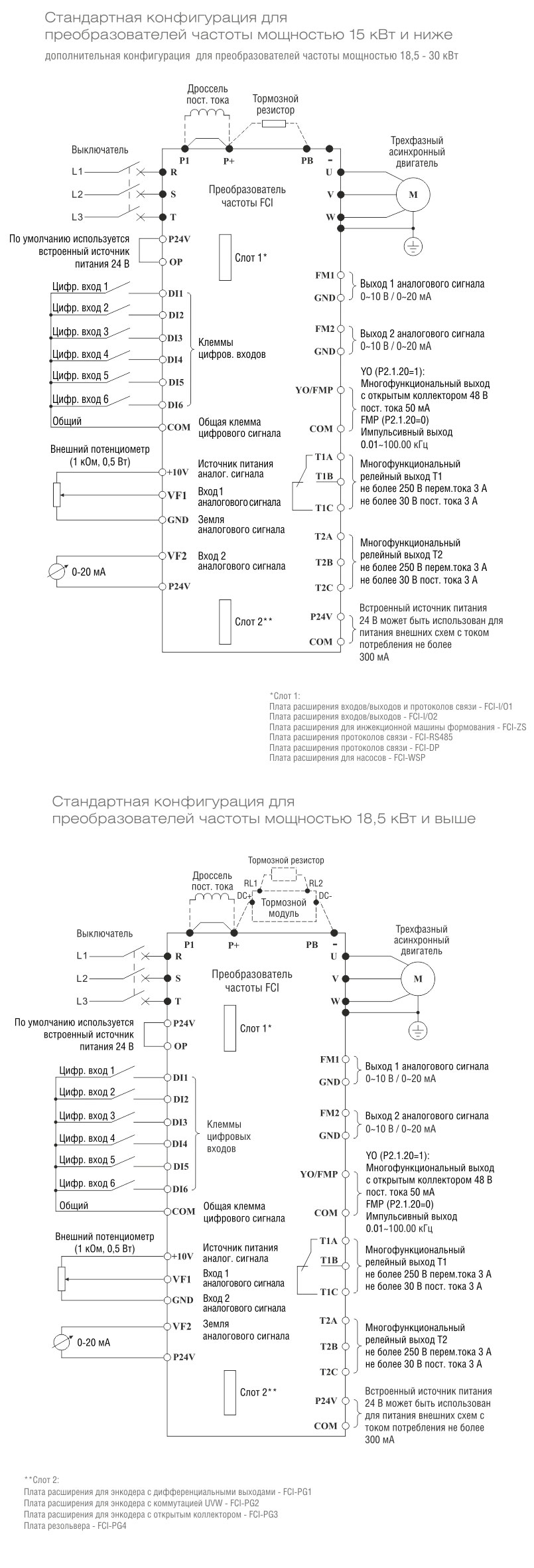 | Обмен данными | Плата управления не снабжена встроенным коммуникационным интерфейсом RS485, требуется внешняя коммуникационная плата расширения. Платы расширения поддерживают стандартные протоколы MODBUS (плата расширения FCI-RS485); PROFIBUS (плата расширения FCI-DP) | ||