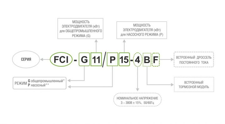 *Общепромышленный режим (тяжелый, G) — используется с нагрузкой с постоянным вращающим моментом. В этом случае величина вращающего момента, необходимого для приведения в действие какого-либо механизма, постоянна независимо от скорости вращения. Примером такого режима работы могут служить конвейеры, экструдеры, компрессоры. **Насосный режим (нормальный, P) — используется с нагрузкой с переменным вращающим моментом. Этот момент имеет отношение к нагрузкам, для которых требуется низкий вращающий момент при низкой частоте вращения, а при увеличении скорости вращения требуется более высокий вращающий момент. Типичным примером такого режима являются насосы.