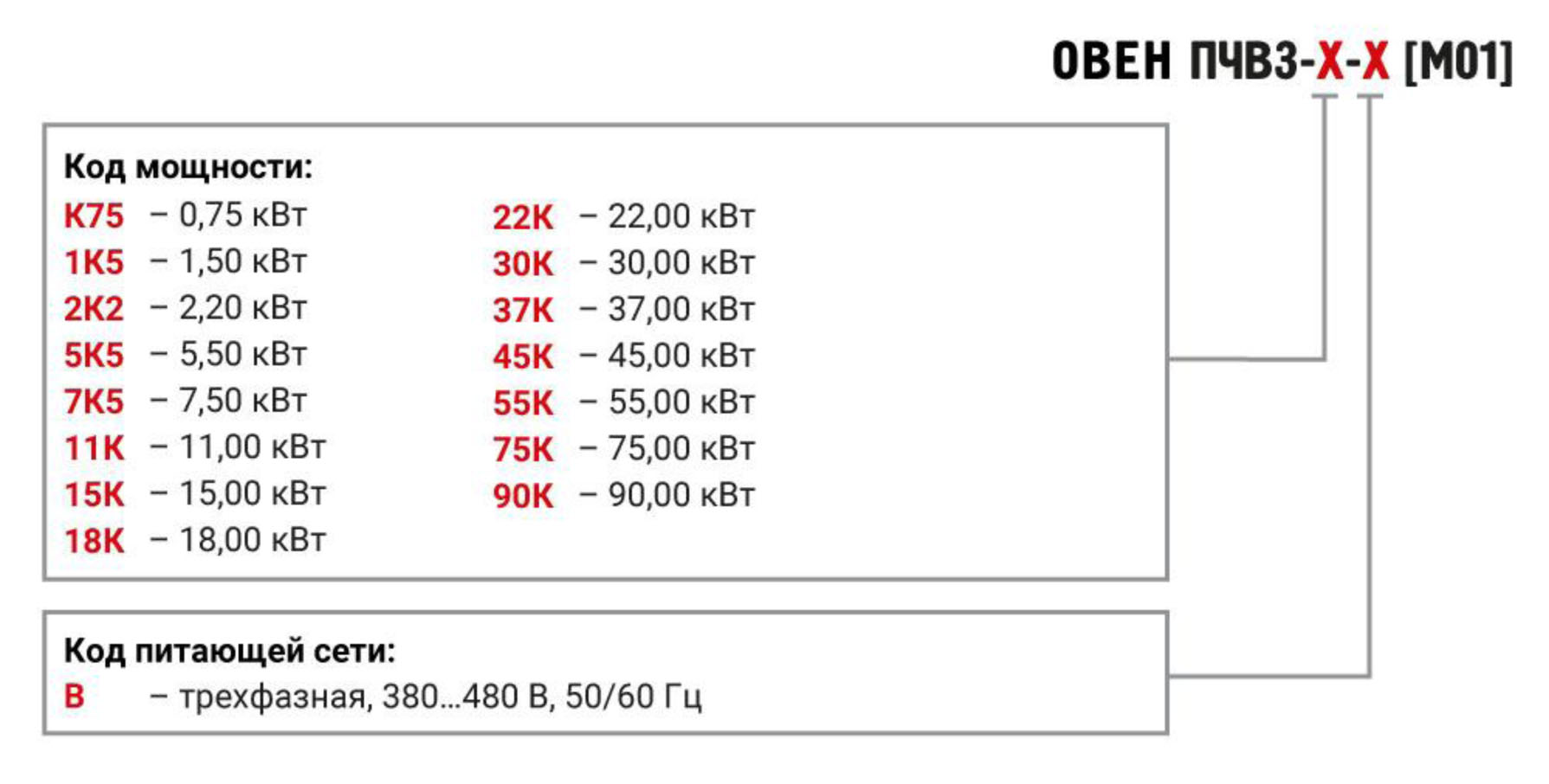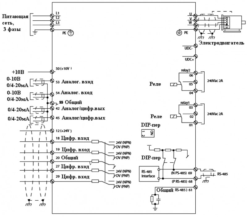3 фазы, 200…240 В (0,25…11 кВт) 3 фазы, 380…480 В (0,37…90 кВт) |