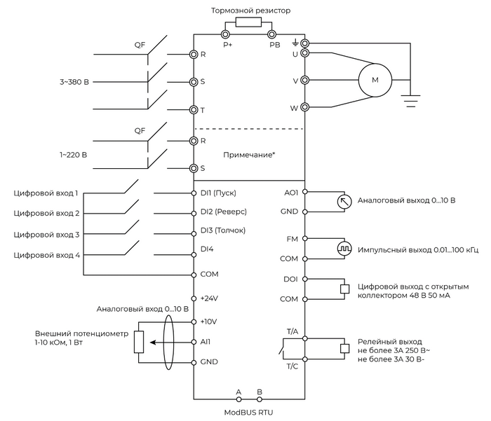 4 цифровых входных клемм (DI) 1 аналоговый вход (AI1) с диапазоном 0 ~ 10 В |