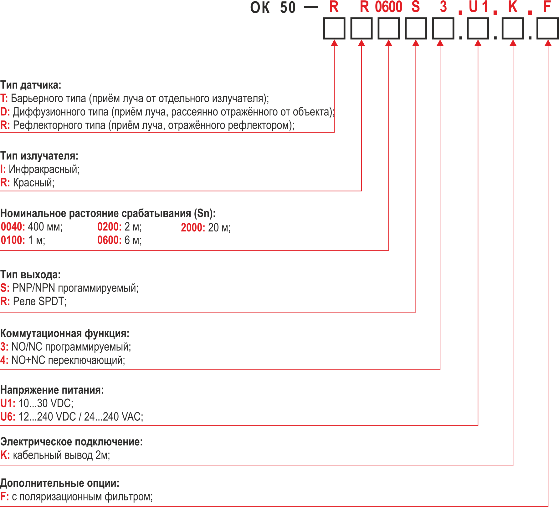 - Модификации датчиков диффузного отражения (D), рефлекторного отражения (R), барьерного типа (T) позволяют организовать принципиально различные схемы контроля объектов.
