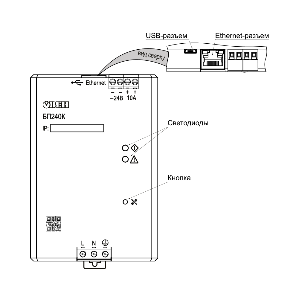 На лицевой панели блока питания БП240К размещены: сервисная кнопка, индикаторы «Работа» и «Авария», поле для нанесения IP-адреса (тонким маркером или наклейка). Сверху панели разъемы для Ethernet и MicroUSB.