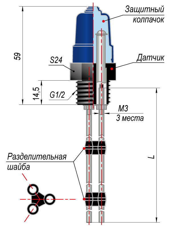 До трех уровней сигнализации, конструкция разделительных шайб (5 шт.) препятствует скоплению жидкости и практически исключает ложное срабатывание датчика |