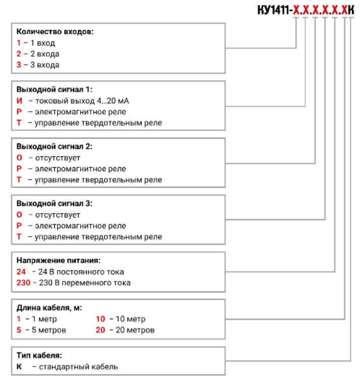 - 3 выхода со следующими управляющими сигналами: токовый И, электромагнитное реле Р, управление твердотельным реле Т.