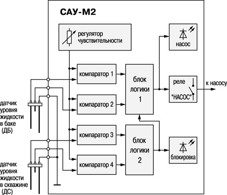 САУ-М2 имеет регулятор чувствительности, позволяющий изменять уровень опорных сигналов компараторов. Вращением ручки регулятора на лицевой панели прибор легко настраивается для работы с различными по электропроводности жидкостями.
