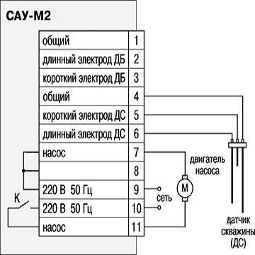 При использовании прибора управления погружным насосом САУ-М2 для осушения резервуара ко входу прибора подключается только один датчик – уровня жидкости в скважине (емкости, предназначенной для отбора жидкости). Реле «НАСОС» выключается при осушении длинного электрода (т. е. электрода нижнего уровня) датчика.