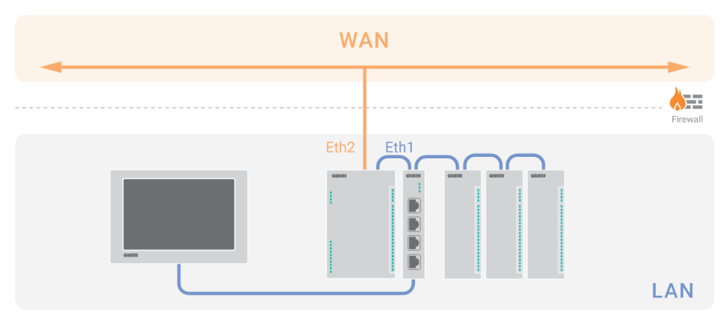 Встроенные в контроллер два порта Ethernet и наличие межсетевого экрана позволяют применять его в качестве шлюза между промышленной сетью и сетью предприятия.