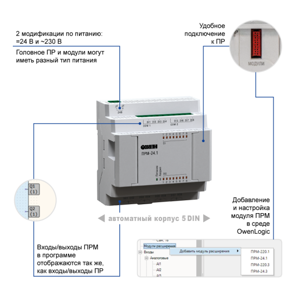 Модули расширения ОВЕН ПРМ предназначены для увеличения количества входов и выходов программирумых реле ОВЕН ПР: