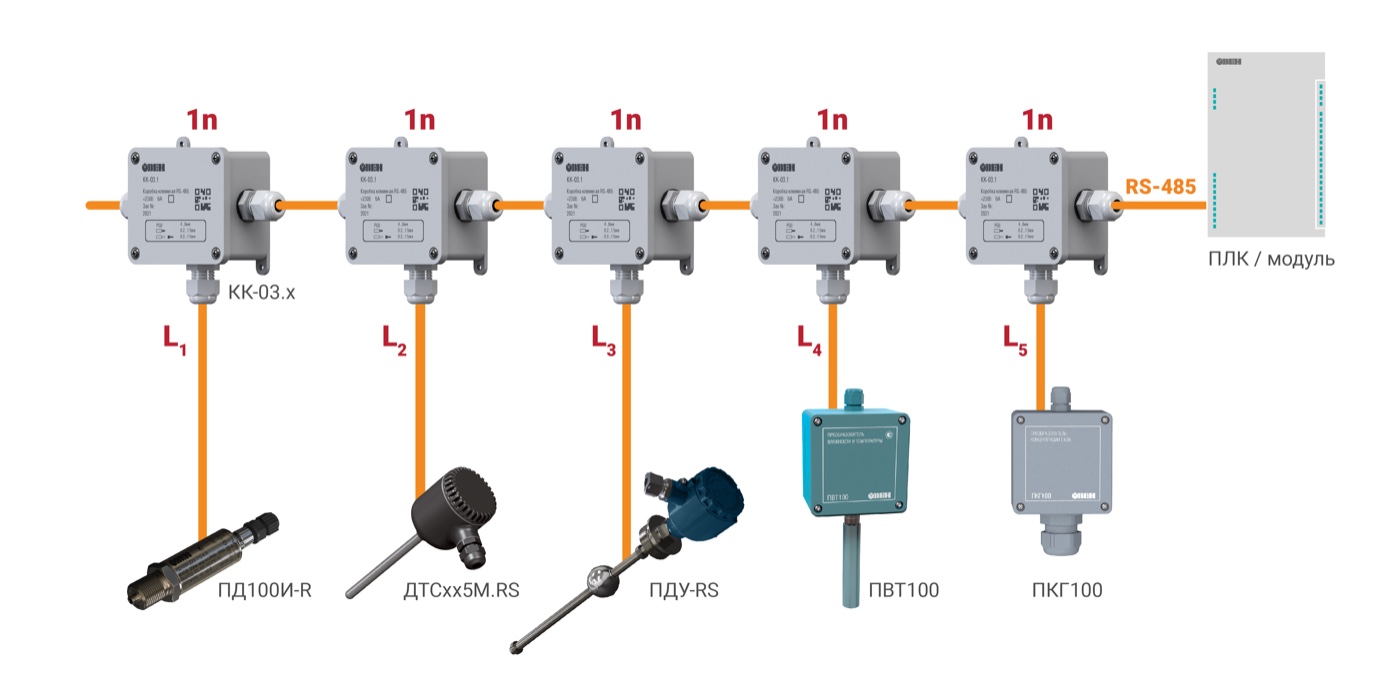 Из рисунка мы видим, что у нас на общей магистрали установлено 5 коробок КК-03 и от каждой по 1 ответвлению на датчик, получается n = 5.