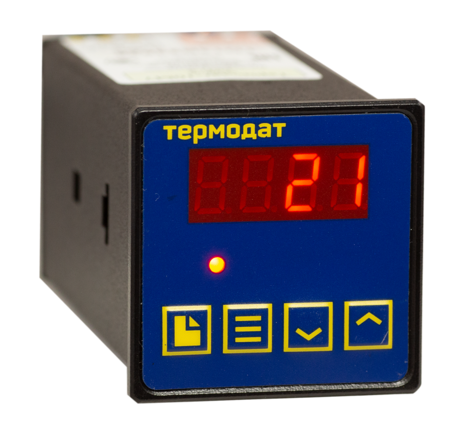 Термодат-10М7-М - одноканальный измеритель температуры, аварийный сигнализатор и ПИД-регулятор со светодиодными индикаторами. Прибор имеет универсальный вход, предназначенный для подключения термопар или термосопротивлений, а также датчиков с токовым выходом. Разрешение 1°С или 0,1°С задается пользователем. Может управлять как нагревателем, так и охладителем. Интуитивно понятное управление обеспечивается 4 кнопками внизу экрана.