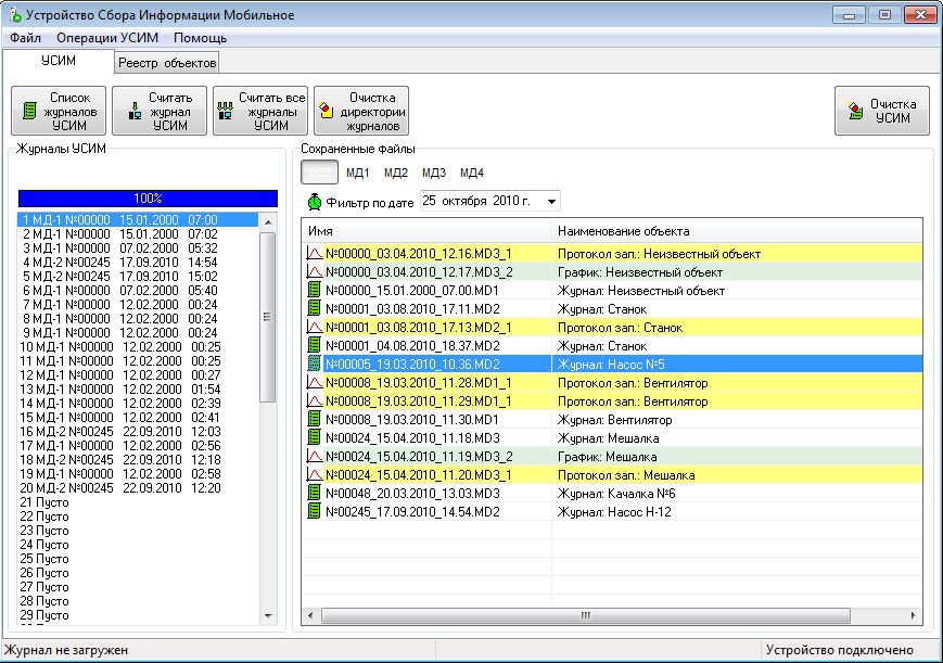Для ведения упорядоченной отчетности предусмотрена возможность присвоения символьного имени (позиционного обозначения, например) каждому объекту оборудованному прибором защиты. Это достигается путем ведения специального реестра объектов. Каждый прибор имеет уникальный литерный номер, присваиваемый при изготовлении, в реестре объектов однократно вводится соответствие этому номеру и типу прибора символьного имени. Далее при считывании журнала событий с устройства УСИМ или с помощью адаптера USB будет автоматически идентифицироваться его принадлежность к конкретному объекту в привычном для эксплуатационного персонала виде (Насос Н-1, Компрессор М-2 и т.д.).