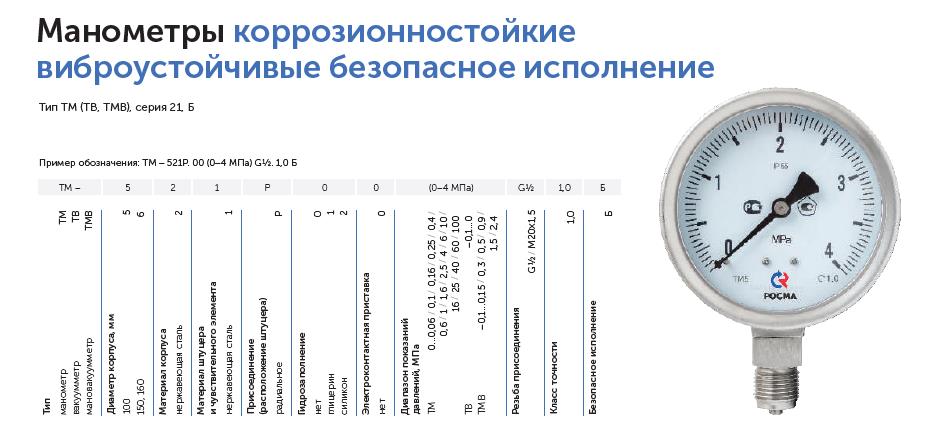 Тип ТМ (ТВ, ТМВ), серия 21, Б. Промышленные коррозионностойкие манометры, устойчивые к воздействию агрессивных измеряемых сред, с возможностью гидрозаполнения (виброустойчивый), для предприятий с повышенными требованиями к безопасности.