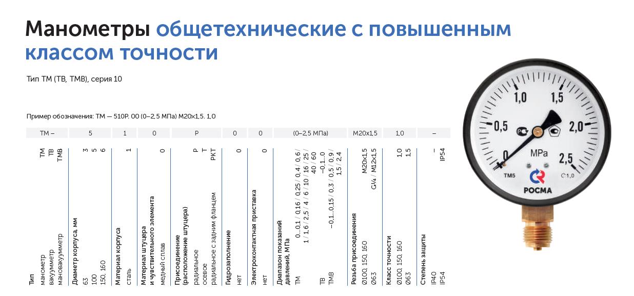 Тип ТМ (ТВ, ТМВ), серия 10. Манометры общетехнические с повышенным классом точности предназначены для измерения давления неагрессивных к медным сплавам жидких и газообразных, не вязких и не кристаллизующихся сред.