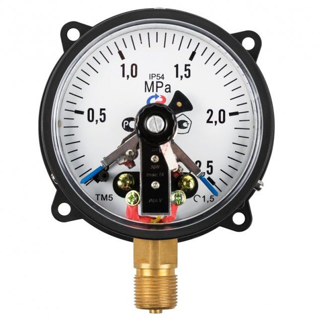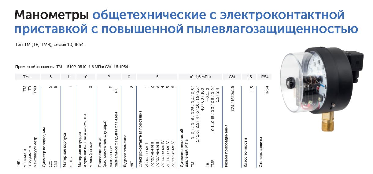 Тип ТМ (ТВ, ТМВ), серия 10, IP54. Манометры с электроконтактной приставкой с повышенной пылевлагозащищенностью предназначены для управления внешними электрическими цепями в схемах сигнализации, автоматики и блокировки технологических процессов.