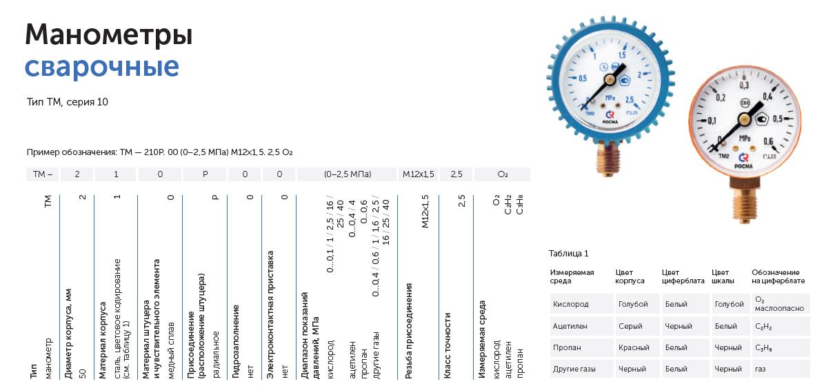 Сварочный (газовый) манометр применяется для измерения давления в жидких и газообразных, не вязких и не кристаллизирующихся измеряемых средах, с температурой до 120 °C, неагрессивных к медным сплавам. Сварочные манометры производятся с диаметром корпуса 50 мм и обладают классом точности 2,5. Корпус манометра для редуктора выполнен из стали и имеет своё цветовое кодирование в зависимости от назначения прибора. В некоторых случаях прибор комплектуется защитным резиновым кожухом (кислородный манометр — голубой, ацетиленовый — серый, пропановый — красный и черный цвет для других газов). Газовые манометры изготавливаются только с радиальным расположением штуцера и имеют различный диапазон показаний давлений в зависимости от измеряемой среды.